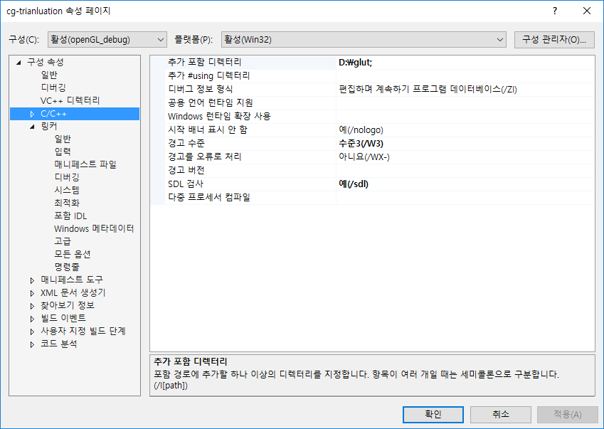링커-일반 탭으로 들어가서 포함 디렉터리에 "D:\glut"(자신이 GLUT 압축을 푼 위치)을 추가한다.