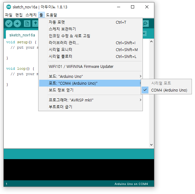 아두이노를 PC에 연결하고, 아래와 같이 메뉴바 -> 툴 -> 포트 -> COM숫자 선택(연결된 위치 선택)하면 된다.
