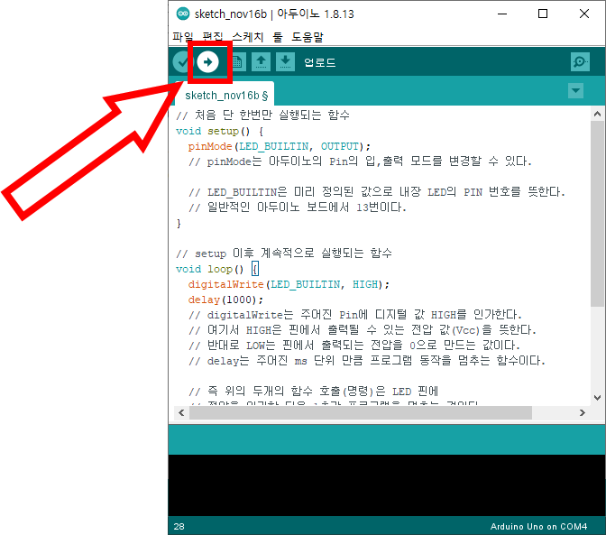 프로그램을 아두이노에서 실행하기 위해서는 아래와 같이 버튼을 클릭하면 된다. (기본적으로 모든 코드는 저장되어야만 컴파일되어 로드된다. 따라서 저장하지 않고 업로드를 눌러도 자동으로 저장 시퀀스를 통한 다음 아두이노에 로드된다.)