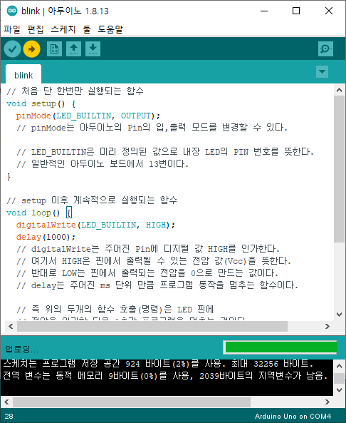 처음 IDE를 열게되면 기본적으로 두 개의 함수가 작성되어 있다. 이 함수는 setup과 loop이다.