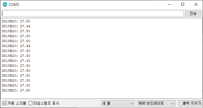 아래와 같이 시리얼 모니터에서 LM35에서 읽은 온도 값이 출력된다.