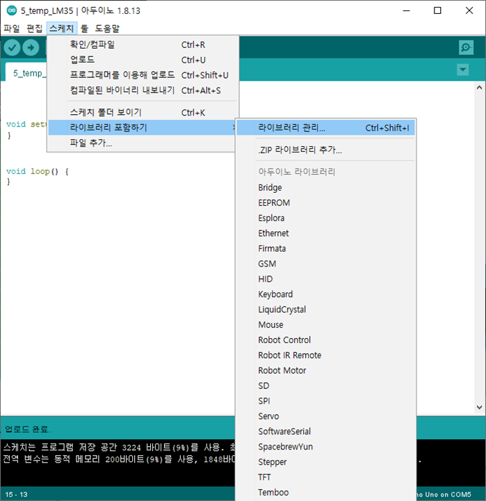 (1) 상단 메뉴의 스케치-> 라이브러리 포함하기 -> 라이브러리 관리 혹은 ctrl + shift +I를 눌러 준다.