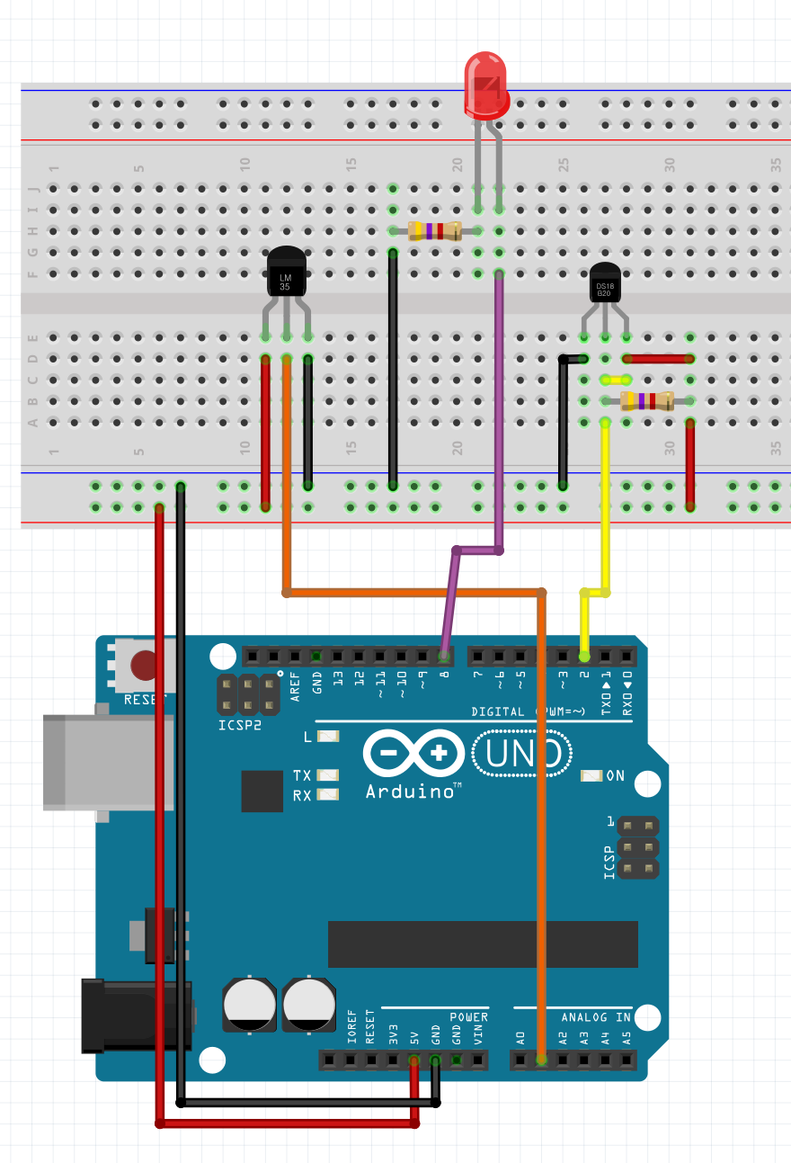 LM35는 A1, DS18B20은 D2 그리고 LED는 D8핀을 이용할 것이다.