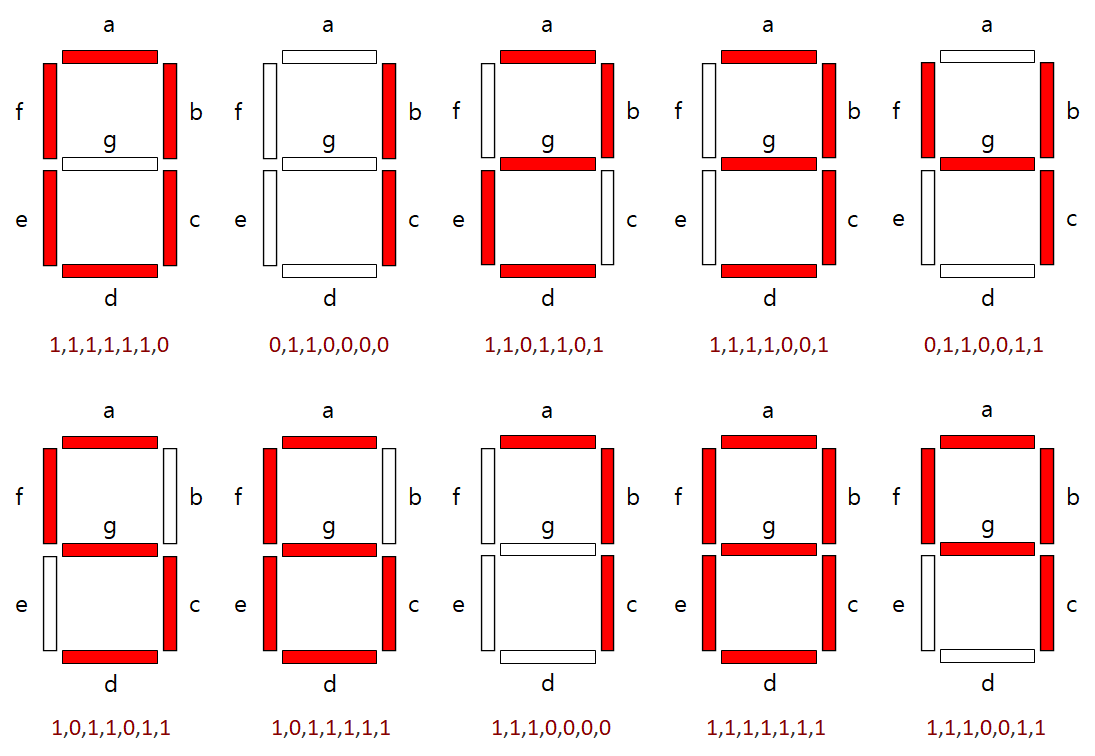 세그먼트의 7개의 LED를 시계 순서대로 a,b,c,d,e,f,g하면, 아래와 같이 숫자를 표현할 수 있다.