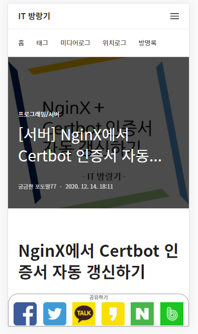 적용 버튼을 눌러주고 블로그에 들어가보면 정상적으로 하단에 고정된 공유 버튼이 생긴 것을 알 수 있다.