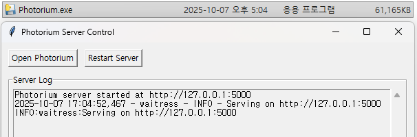 Photorium은 복잡한 설치 과정 없이, 실행 파일(photorium.exe) 하나로 모든 것을 해결할 수 있도록 설계되었습니다.